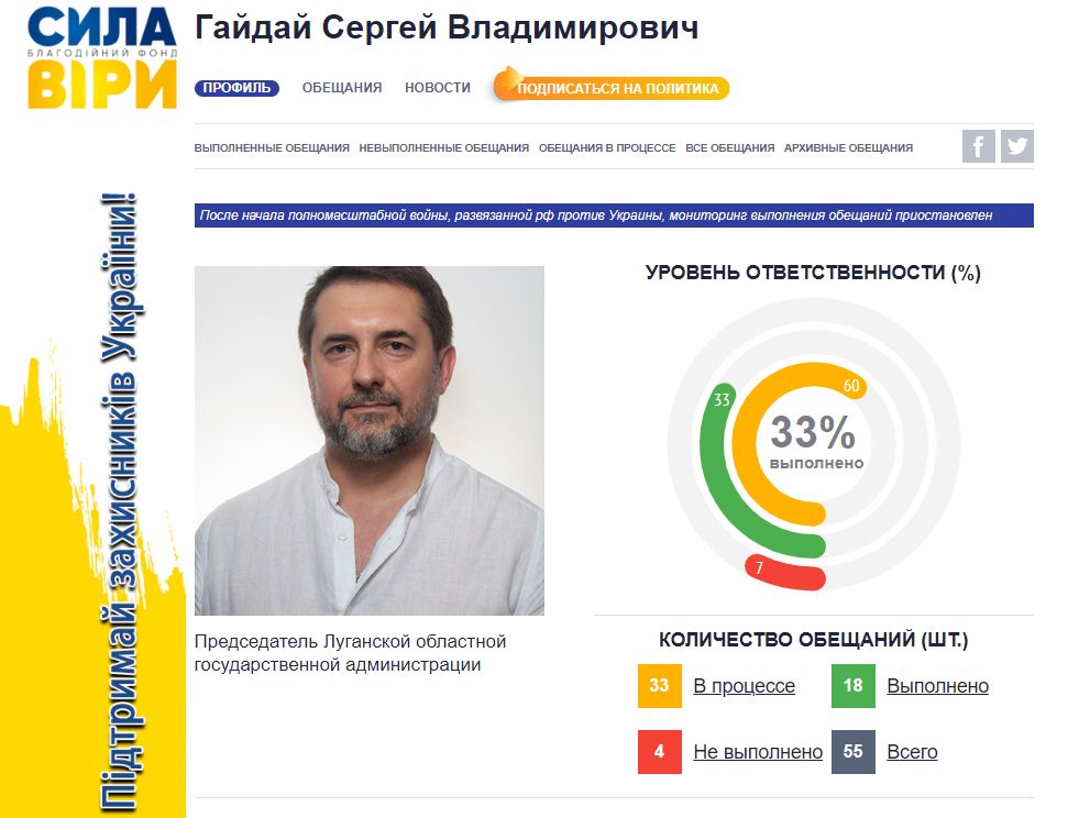 На украинском аналитическом портале "Слово и Дело" уровень ответственности Гайдая как политика составляет 33%. Рейтинг мал, да удал: в биографии Гайдая есть восемнадцать выполненных обещаний против невыполненных четырёх. Он возглавляет Луганскую областную военную администрацию с 25 октября 2019 года.