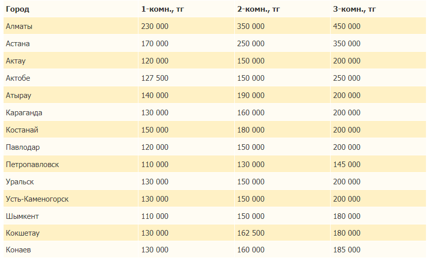 Самая дорогая аренда жилья – в Алматы (шесть тысяч тг/кв. м в среднем).