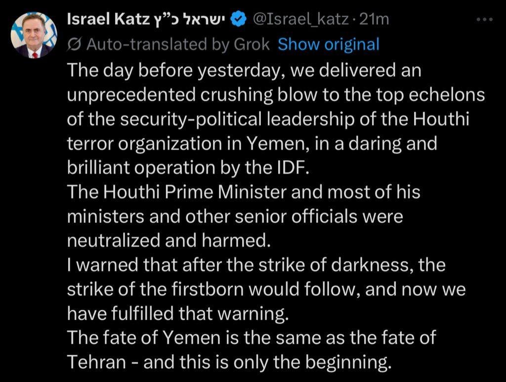 Позже глава Минобороны Израиля Исраэль Кац подтвердил, что ЦАХАЛ ликвидировал высшее руководство йеменских хуситов.