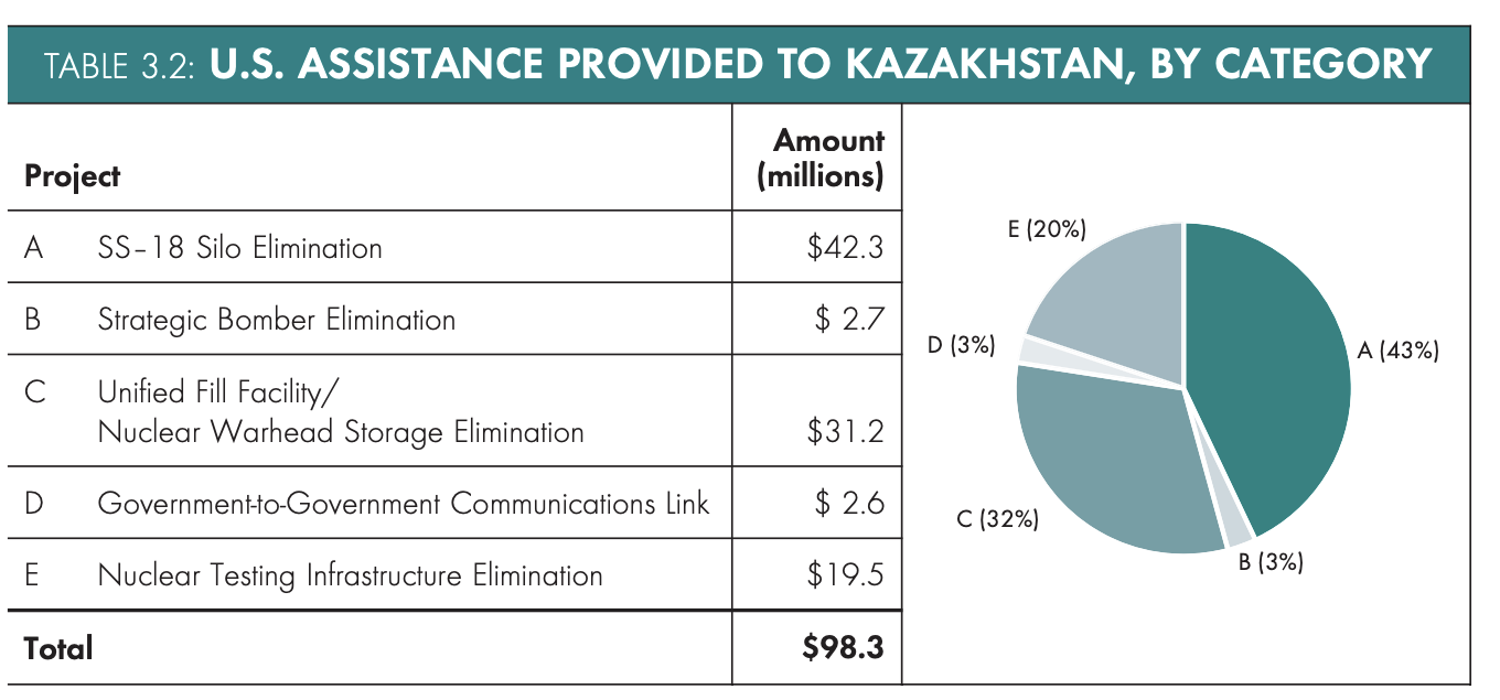 Американские программы по сокращению угрозы (CTR — Cooperative Threat Reduction) в Казахстане привели к полной денуклеаризации страны, которая, если бы сохранила своё ядерное вооружение, стала бы третьим по величине ядерным государством в мире.