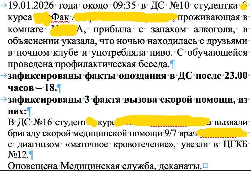 Редакция получила сразу несколько таких сводок. Например, в документе за 19 января прямо указано имя студентки и её состояние: студентка доставлена с «запахом алкоголя».