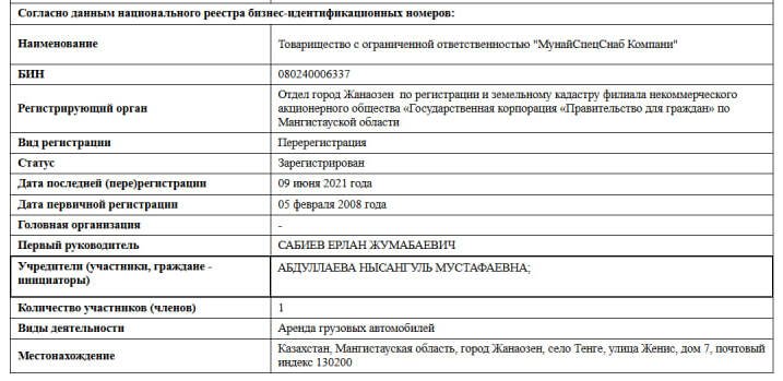 «МунайСпецСнаб Компани» работает с 2008 года. Оказывает транспортно-логистические услуги для нефтесервисных предприятий, в том числе для дочерних структур КМГ. Согласно данным Egov учредителем ТОО числится Нысангуль Абдуллаева.