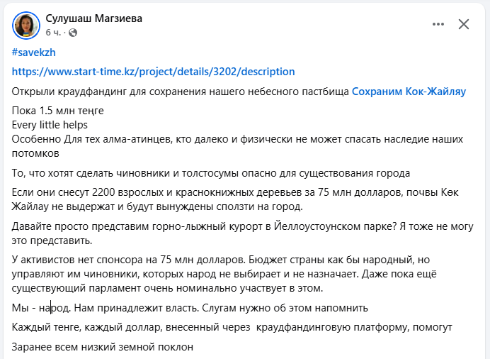«Сегодня часто говорят, что движению воздуха в городе мешают высотные здания. Но дело не только в них. Любая урбанизация повышает температуру. Асфальт, бетон, плотная застройка создают тепловой остров. На Кок-Жайляу — настоящая живая вселенная. Ландшафты, тянь-шаньские ели, яблони Сиверса, сотни видов растений, птиц, насекомых животных. Тысячи алматинцев поднимаются туда в любое время года. Не за инфраструктурой, а за тишиной, свободой и восстановлением. Горы — это отдушина для горожанина. И когда горы начинают застраиваться, когда превращаются в продолжение города, то теряют свою главную ценность — подлинность. Нам говорят, что горнолыжный курорт станет драйвером развития. Что придут миллионы туристов. Но мировой опыт показывает другое. Горнолыжные курорты становятся всё более уязвимыми из-за климата. Особенно в горах средней высоты — таких, как Кок-Жайляу». сказала экоактивистка Ажар Джандосова.