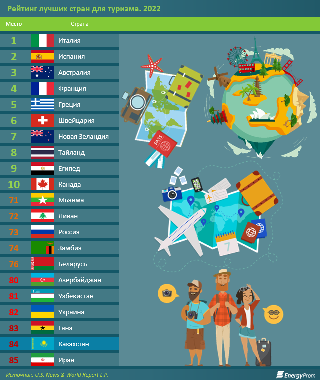 Авторитетный американский журнал U.S. News составил рейтинг лучших стран для туризма. Казахстан оказался на 84-й строчке, заняв предпоследнее место среди 85 стран мира.