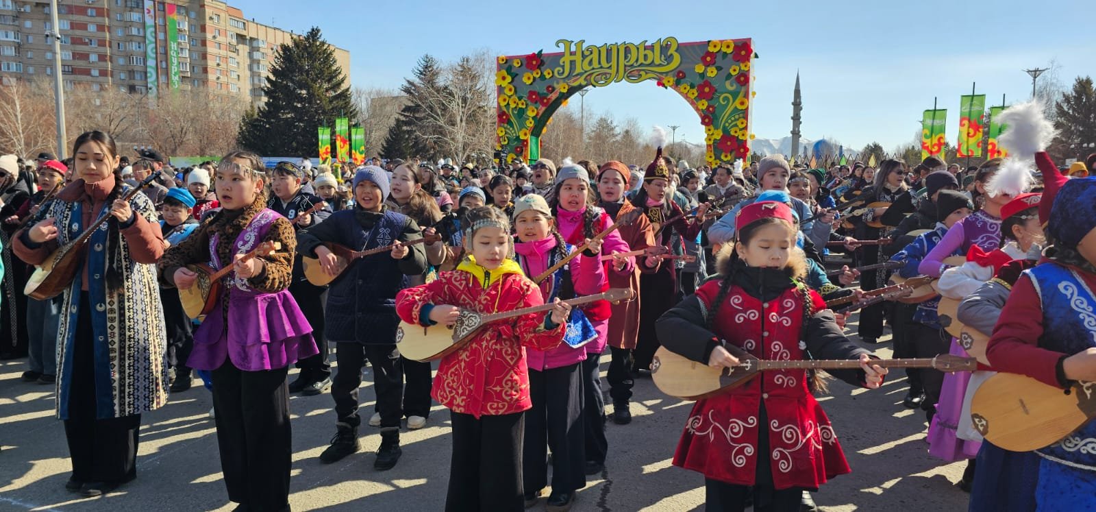 На площади Республики одновременно сыграли 5201 домбристов и исполнили народную песню в национальной одежде. Для исполнения выбрали традиционную компаозицию «Ақ Бұлақ».