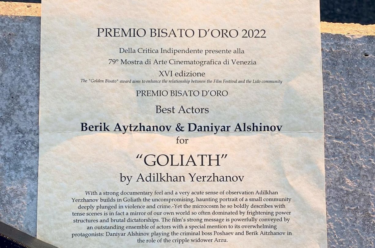 Причём история противостояния казахстанских Давида и Голиафа удостоилась приза от кинокритиков Premio Bisato D’Oro – актёрам Берику Айтжанову и Данияру Алшинову за их мастерское воплощение образов «маленького человека» Арзу и всесильного «крёстного отца» Пошаева.