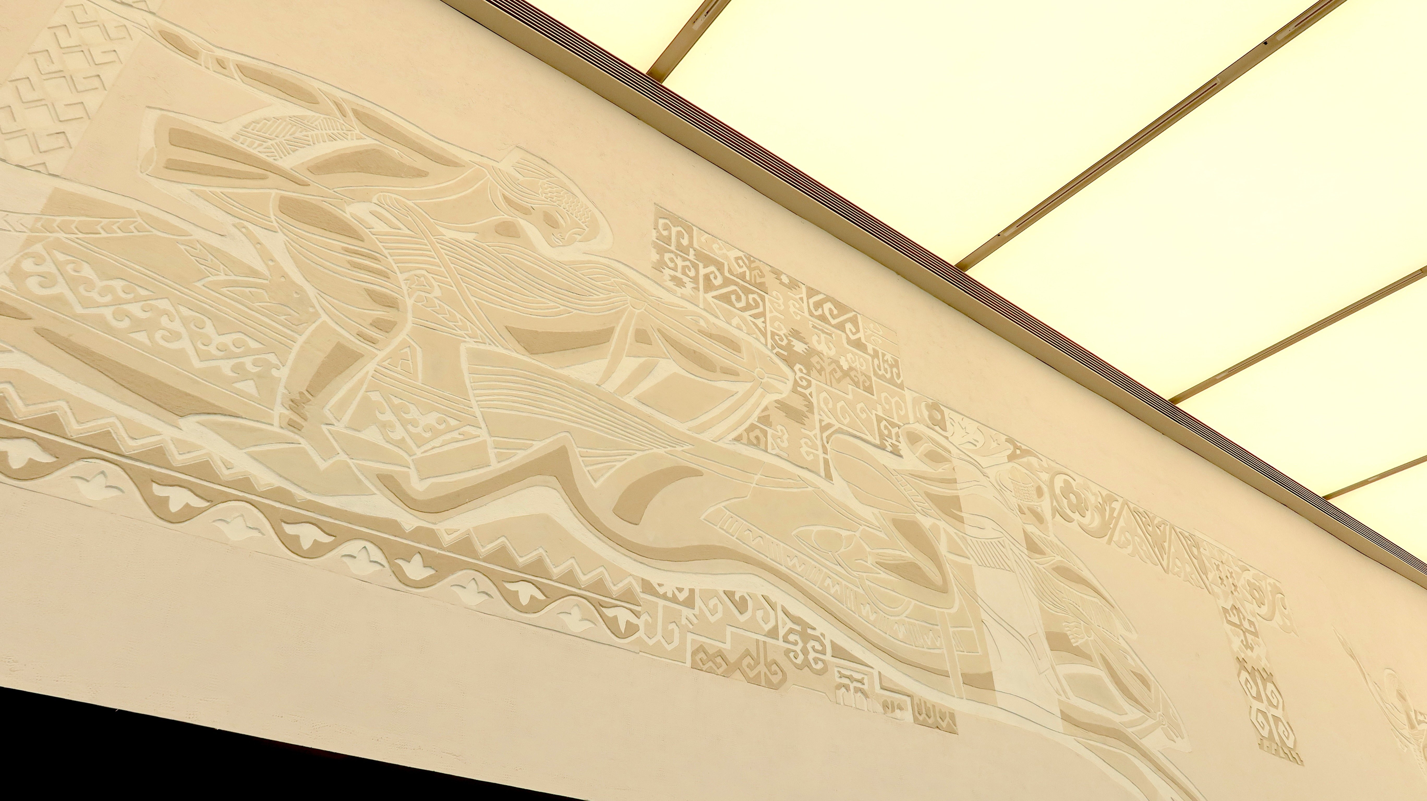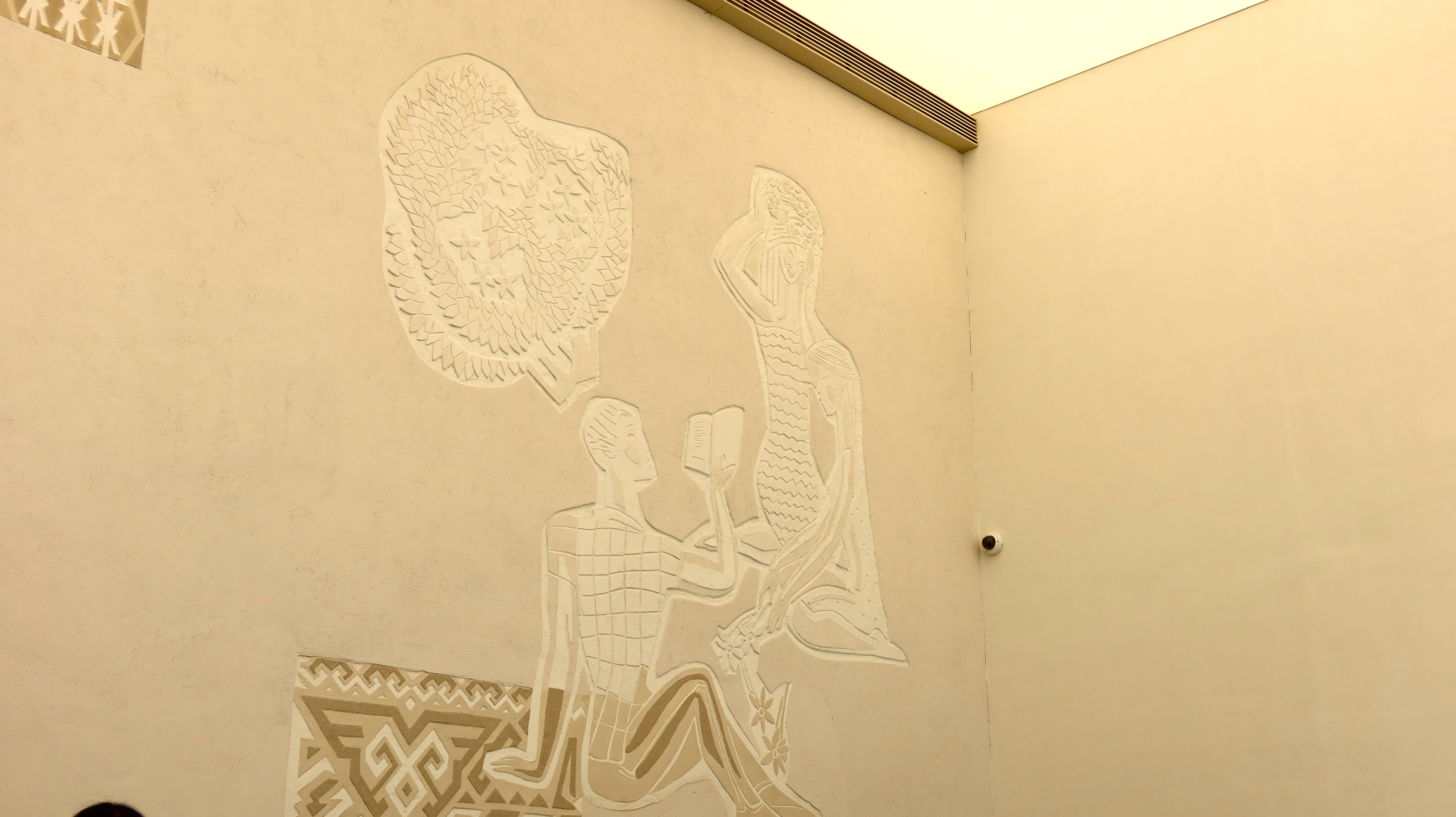 Десятилетия назад от монументального здания хотели адаптивности. Внутри были точки питания, фотосалоны, ночной клуб и кальянная. За время всех перерождений многие фрагменты сграффито Евгения Сидоркина канули в лету. Но их восстановили. Чтобы показать, что утеряно, а что оригинальное, выбрали систему оттенков. Тёмное означает оригинальную часть изображения, белый цвет — полностью восстановлен.