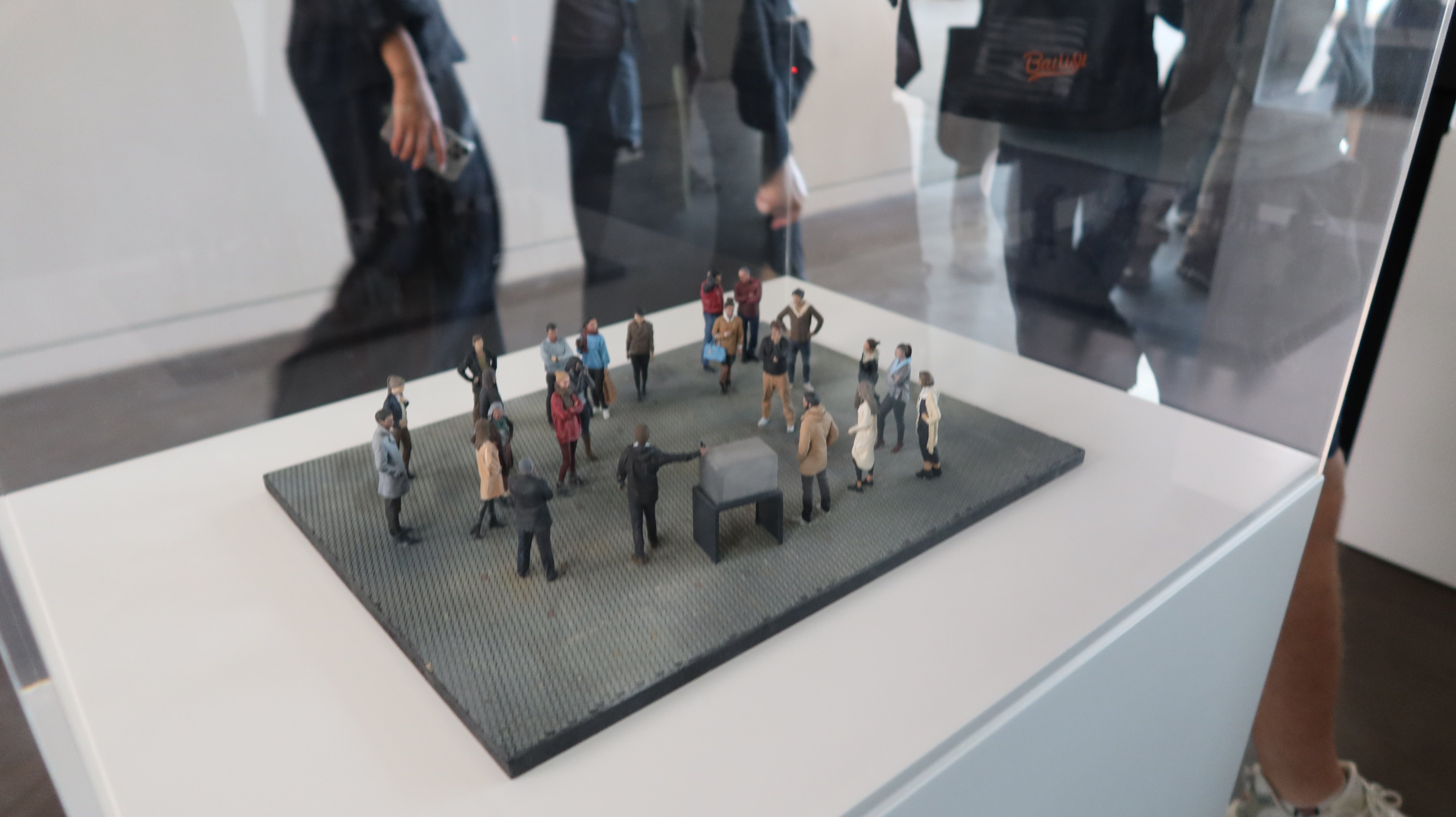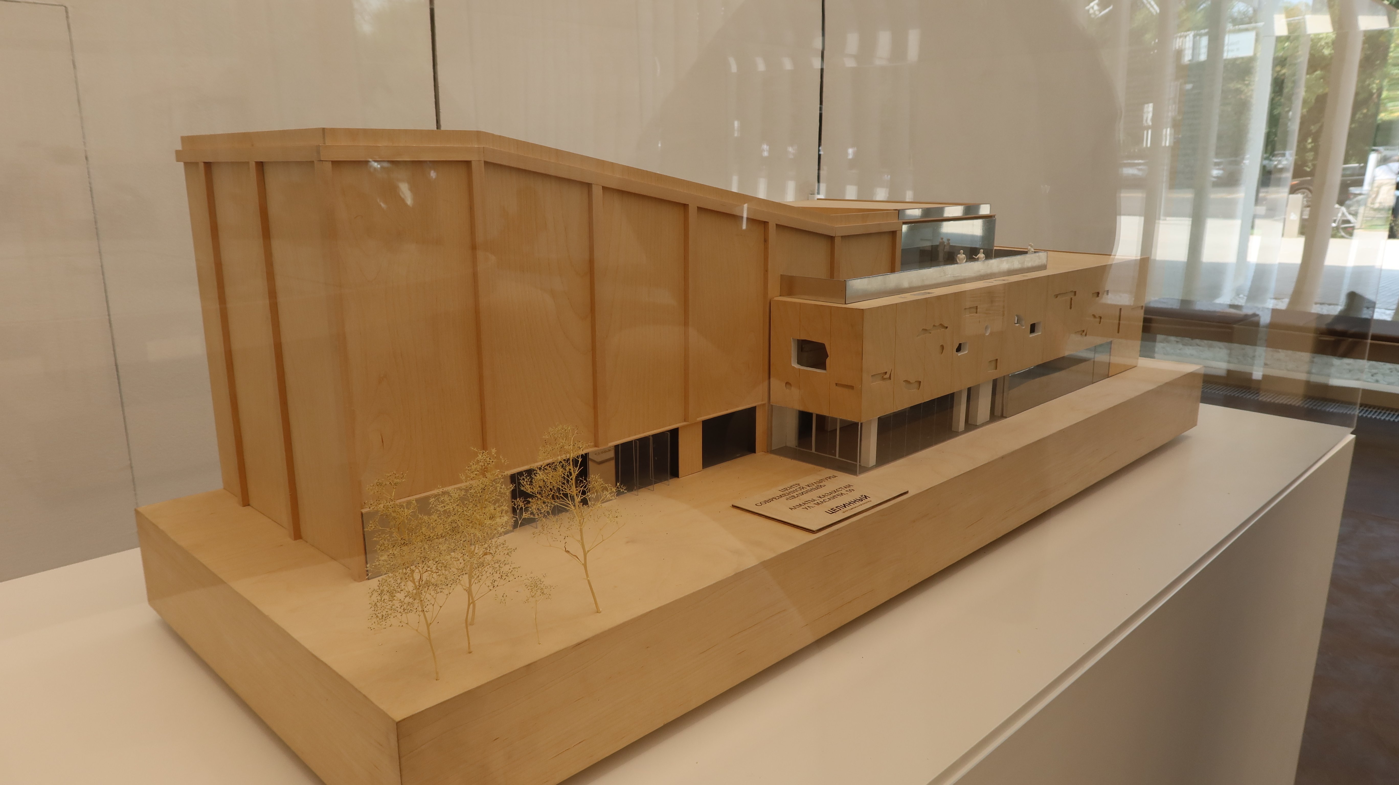 С фотографиями, осколками бывшего здания, вдохновляющими эскизами и предметами.