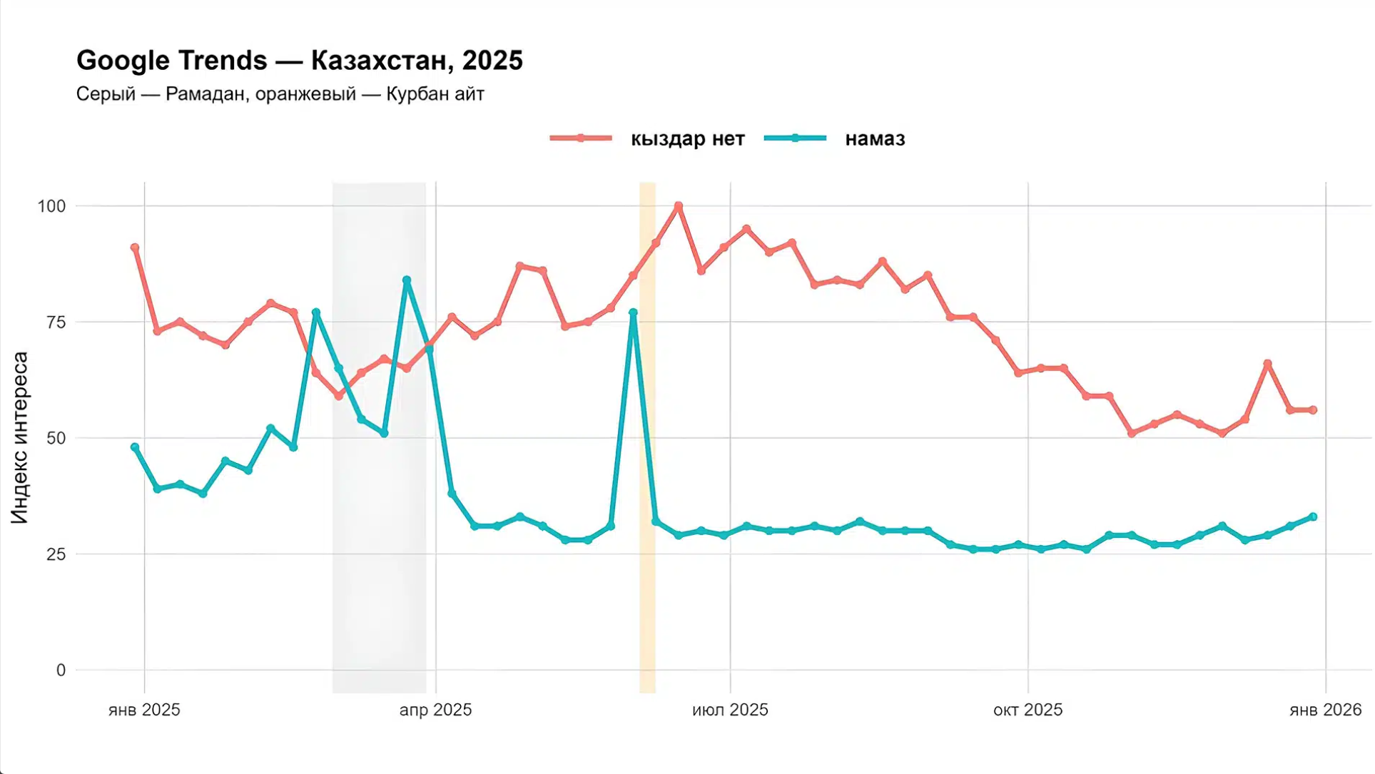 В Казахстане во время религиозных праздников меняется поведение пользователей интернета. Аналитик Нурасыл Абдразакулы сравнил тренды за 2025 год. Как показал анализ Google Trends, в Рамадан и перед Курбан айтом резко растёт интерес к слову «намаз», а запросы по взрослым темам, таким как «қыздар нет», падают.