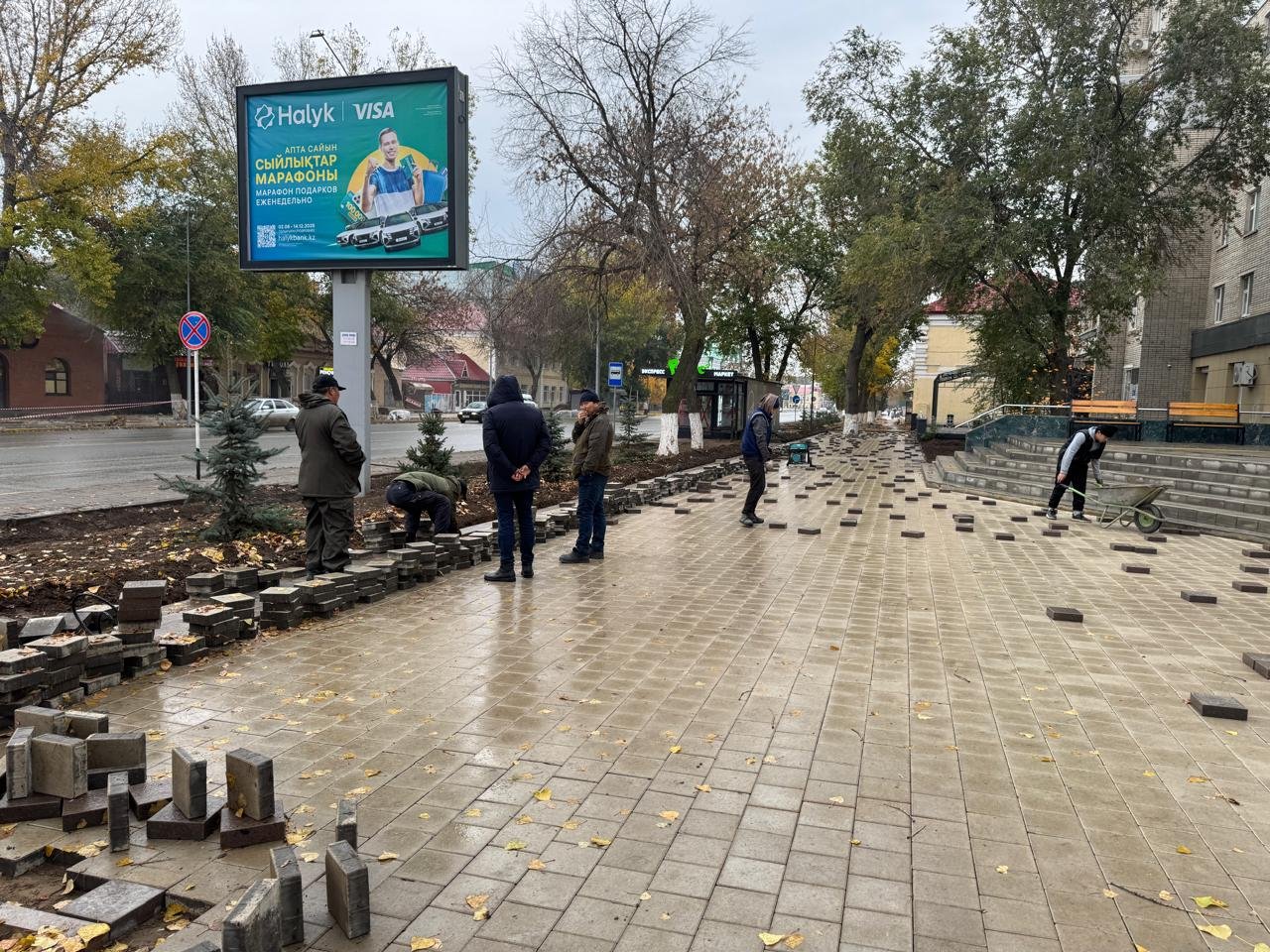 Дальше в ответе подробно рассказывают, где что ремонтируют, обновляют и какую брусчатку укладывают. Перечислять не будем, просто покажем фото и видео. Укладка асфальта по улице Жумагалиева, несмотря на дождливую погоду: