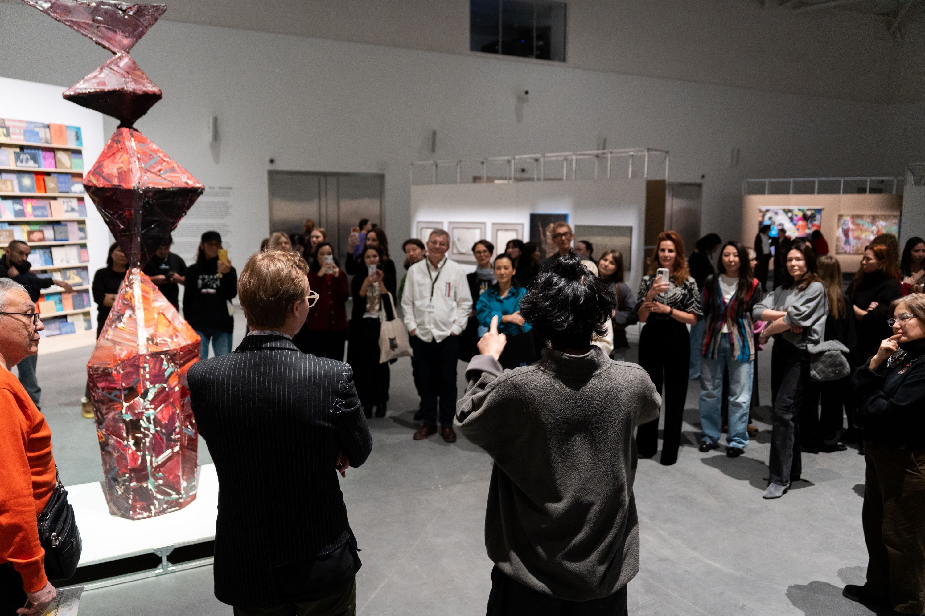 Самый противоречивый и в то же время яркий союз на выставке – Алмагуль Менлибаева и Сергей Маслов. Учитывая обстоятельства их романа (Менлибаева на момент знакомства была несовершеннолетней), приличную разницу в возрасте и шлейф странных историй, который тянется за Масловым, их вычурные и абстрактные работы буквально проходят по грани культуры отмены.