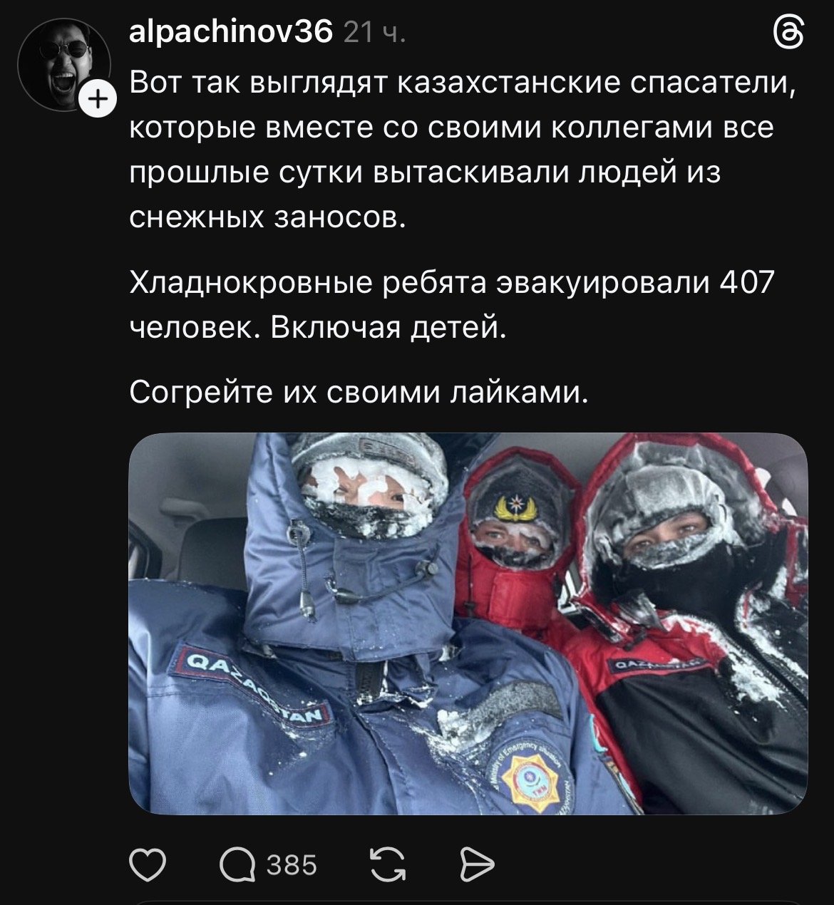 «Вот так выглядят казахстанские спасатели, которые вместе со своими коллегами вытаскивали людей из снежных заносов», написал один из пользователей, опубликовав фото спасателей.