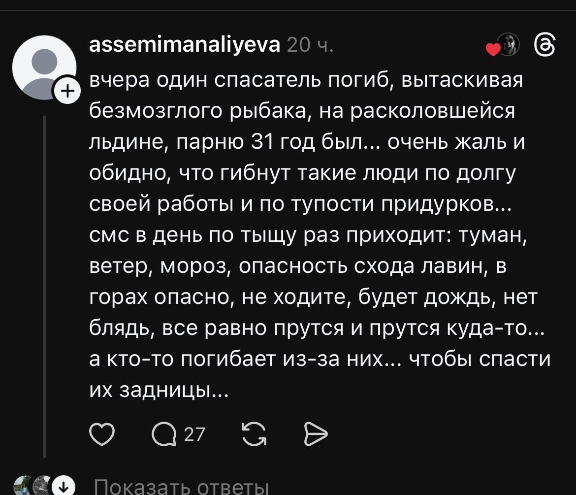 В соцсетях обсуждение спасательных операций сопровождается и более жёсткими комментариями. Некоторые пользователи пишут, что спасателям нередко приходится рисковать жизнью из-за людей, которые игнорируют предупреждения о непогоде. В одном из комментариев упоминается случай гибели спасателя, который, как выяснилось позже, погиб во время спасения рыбака на расколовшейся льдине.
