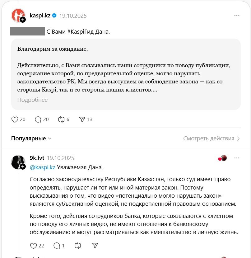 «В тот же день ближе к ночи я зашёл в приложение Kaspi и увидел, что моя учётная запись заблокирована. И пазл в голове сложился. А после того, как я рассказал об этом случае в Threads, под постом в комментариях они ответили мне и всё это подтвердили», добавил Айдос.