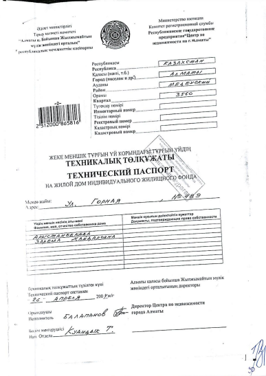 Двухэтажный жилой дом с видом на горы общей площадью 272,50 кв.м. построен в 2003 году. Он находится в Медеуском районе по улице Керей-Жанибек хандар (раньше называлась Горная). В нём есть бассейн и сауна.