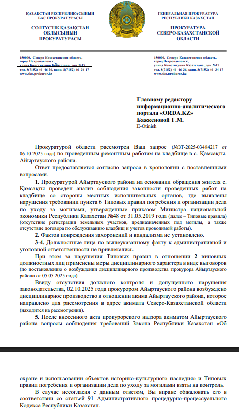 Редакция Orda.kz направила официальный запрос в надзорные органы. В прокуратуре Северо-Казахстанской области сообщили, что во время ремонта на кладбище в селе Камсакты были выявлены нарушения закона, конкретно — п. 6 «Типовых правил организации похорон и содержания кладбищ», утверждённых приказом № 48 от 31 мая 2019 года: