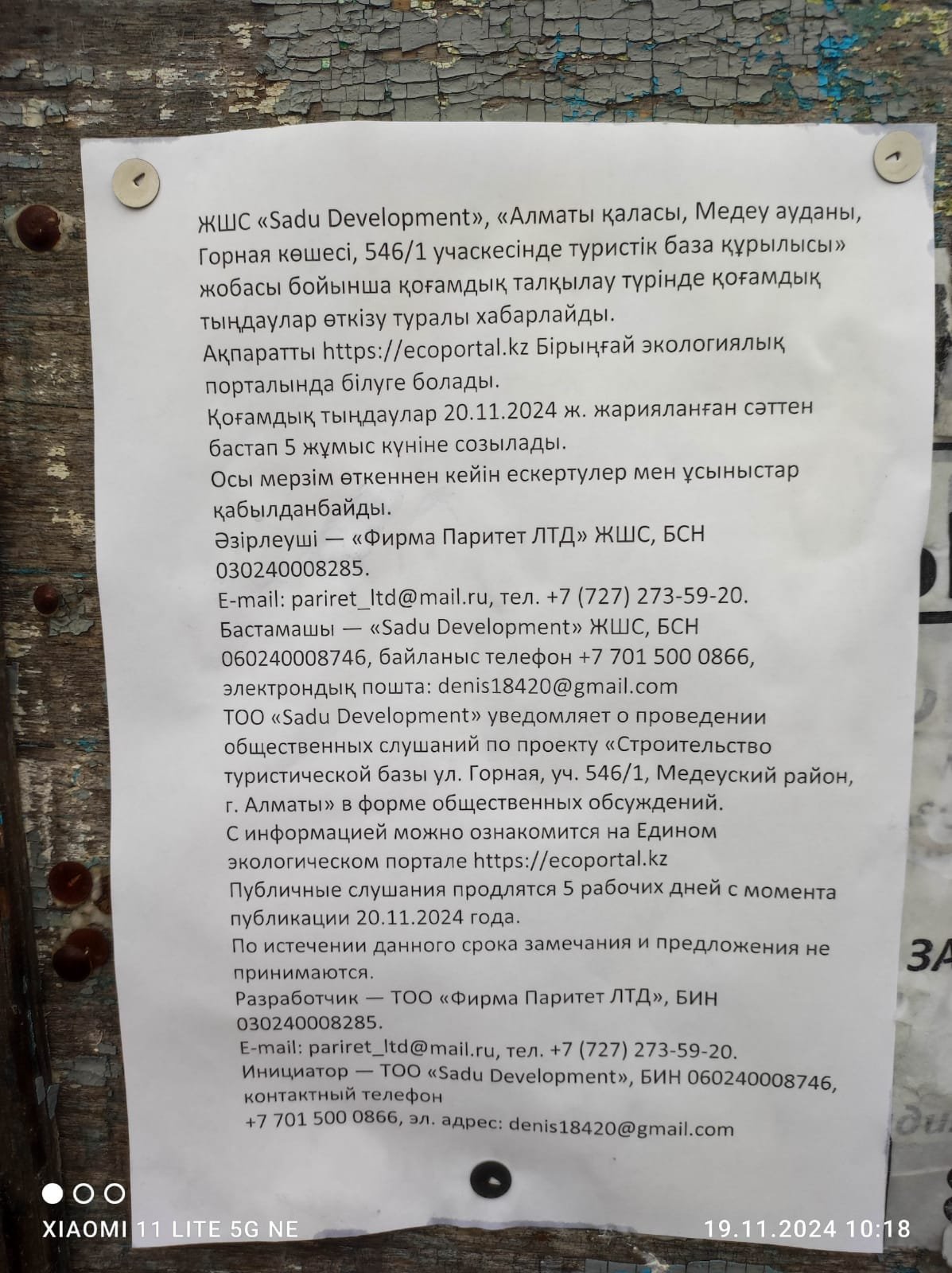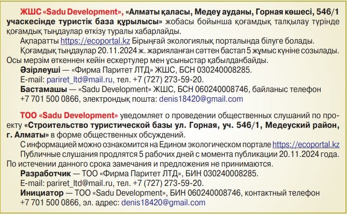 При этом на странице сайта ecoportal.kz сообщается, что Sadu Development приглашало горожан на общественные слушания по этому проекту. Объявление разместили на последней странице 45-го номера газеты «МК в Казахстане» за 2024 год. Когда и где именно пройдут общественные слушания и каким образом, не разъясняется. Конкретной ссылки, по которой можно ознакомиться с информацией по проекту, не даётся.