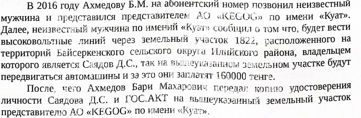 После этого Бари Ахмедов попытался решить вопрос с KEGOC «по-хорошему» — хотя бы получить от нацоператора деньги по рыночной стоимости. Помочь ему в этом деле вызвался сосед, который якобы имел отношение к неким госорганам.
