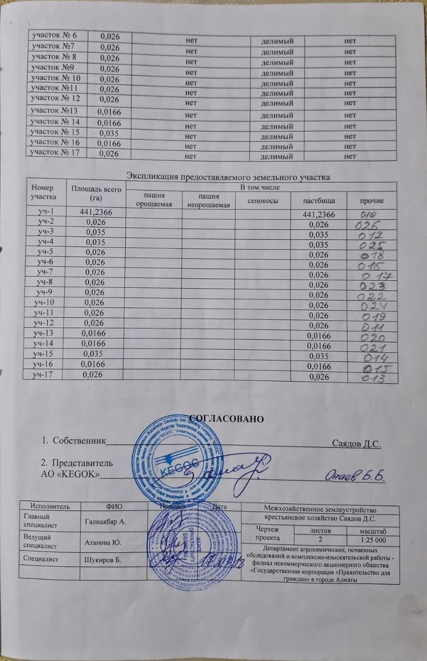 А на схеме раздела земельного участка, составленном отделом земельных отношений Илийского района Алматинской области, подписи Саядова вообще нет. Есть только автограф представителя KEGOC Б. Б. Онаева.