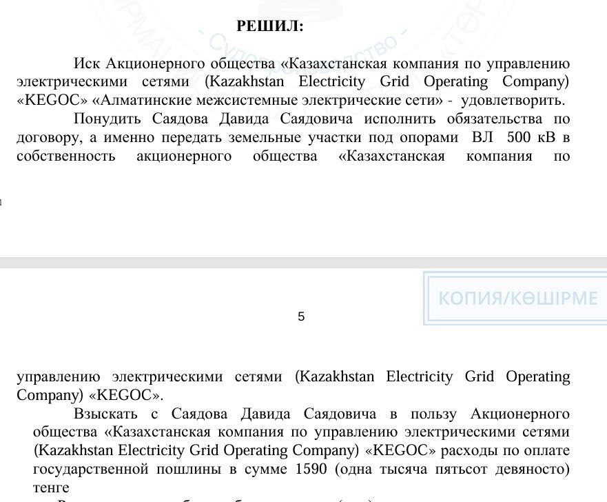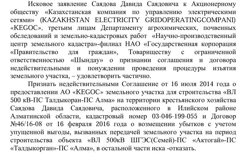 «АО „KEGOC“ не согласно с доводами Давида Саядова и его представителей и не считает их соответствующими действительности. Поскольку во исполнение указа президента Республики Казахстан от 17 ноября 2014 года № 555 с целью обеспечения покрытия дефицита электроэнергии и надёжного электроснабжения экономики населения Алматинского региона акционерным обществом KEGOC построена воздушна линия 500 кВ Талдыкорган — Алма. При этом все мероприятия, связанные со строительством данной линии, выполнены акционерным обществом KEGOC строго в соответствии с требованиями законодательства Республики Казахстан. Так, до начала строительства ВЛ 500 кВ Талдыкорган — Алма с согласия собственника земельного участка Давид Саядов и АО „KEGOC“ заключмли соглашение о предоставлении АО „KEGOC“ во временное землепользование участка под строительство ВЛ 500 кВ и передаче земельных участков под опорами воздушных линий в частную собственность АО „KEGOC“ после завершения строительства. Заключён договор о возмещении убытков с учётом упущенной выгоды на основании отчёта об оценке рыночной стоимости убытков сельхозпроизводства, выполненной независимой оценочной компанией, и произведён платёж».
