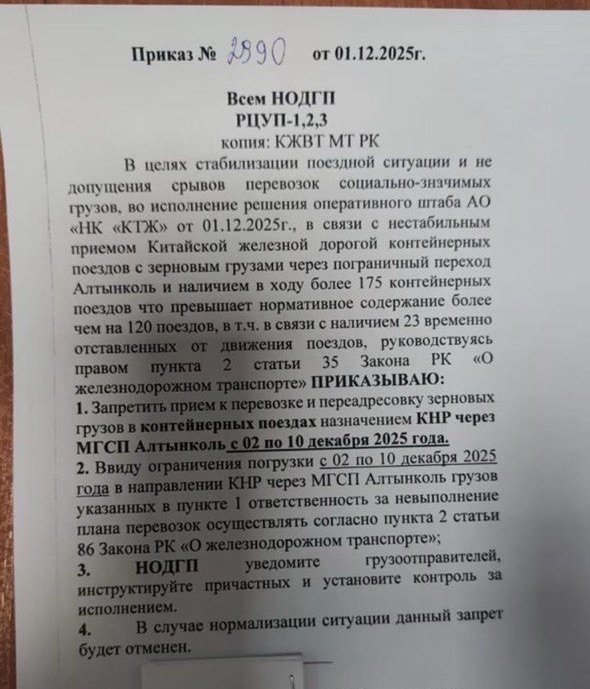 В октябре и ноябре КТЖ также вводила повторяющиеся запреты на станциях Достык и Алтынколь. Это нарушило графики вывоза более 200 поездов. Экспортёры фиксируют сбои в выгрузке и финансовые потери. За два месяца КТЖ фактически действует как регулятор, самостоятельно ограничивая экспорт.