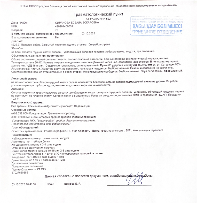 Автор публикации рассказал, что врачи районной больницы отказались принять её, ограничившись обезболивающим уколом. Позже, когда родственники повезли женщину в город, в травмпункте диагностировали у 77-летней Есбалы Сирановой перелом ребра, что подтверждается медицинской справкой.