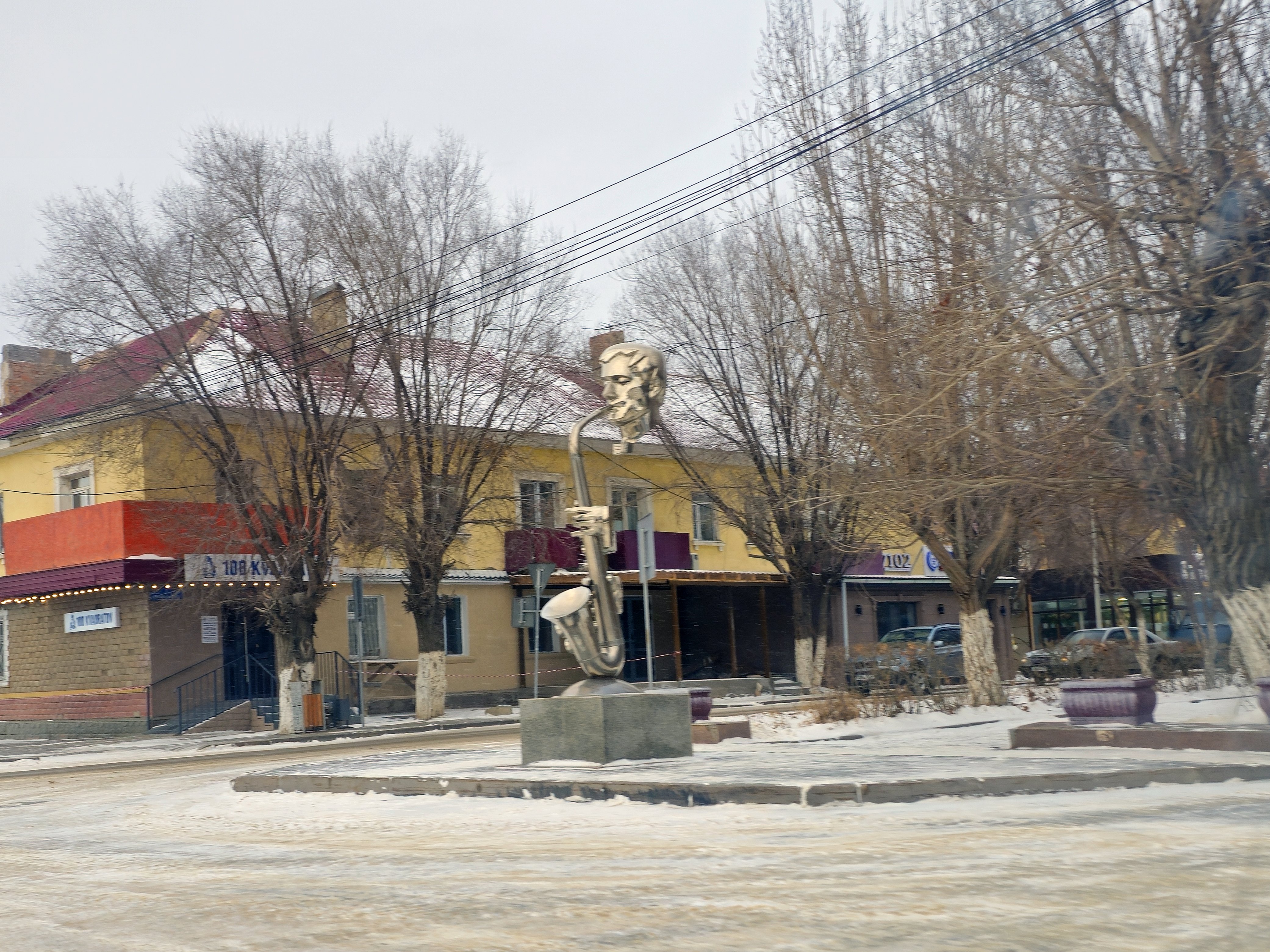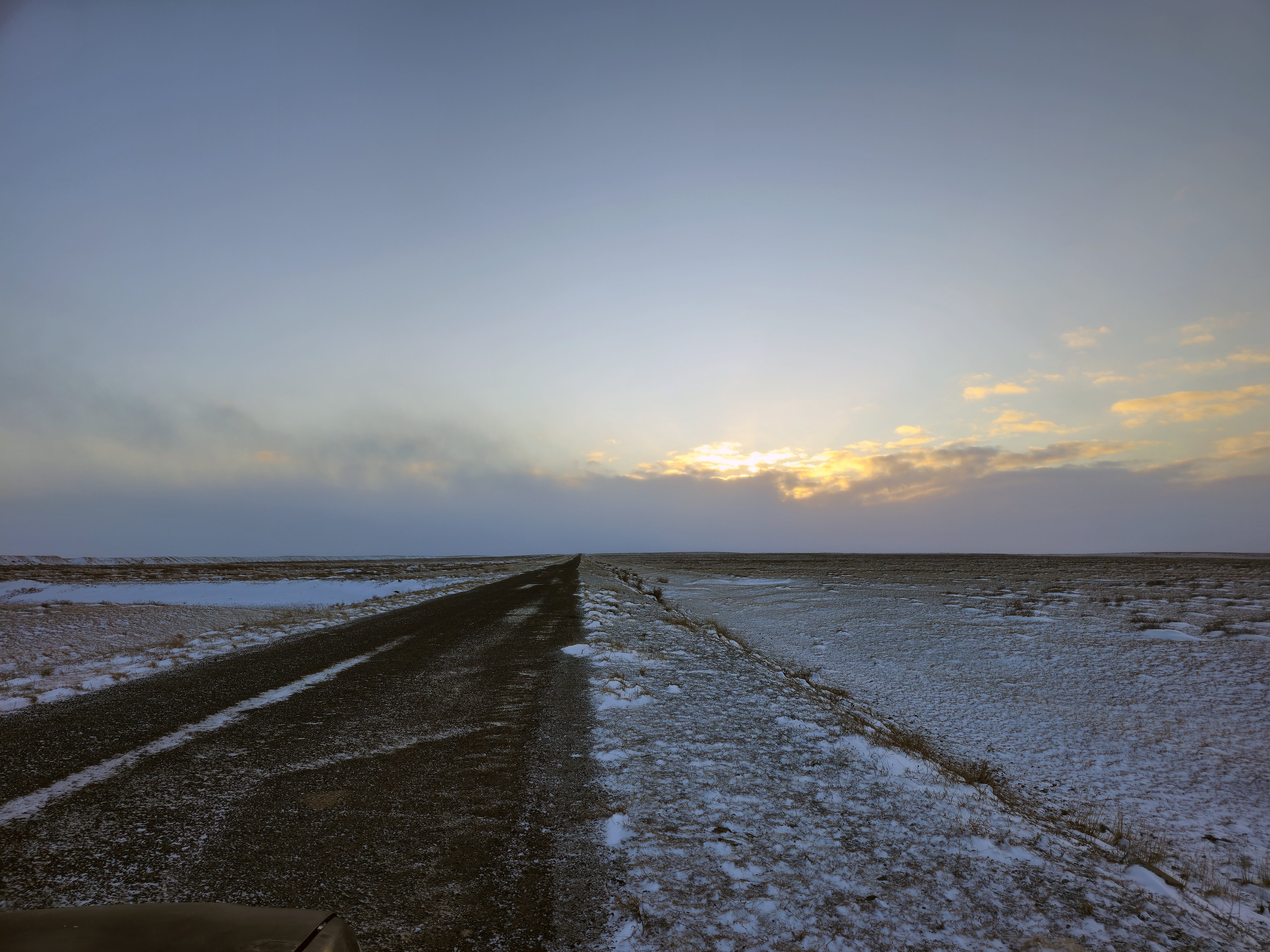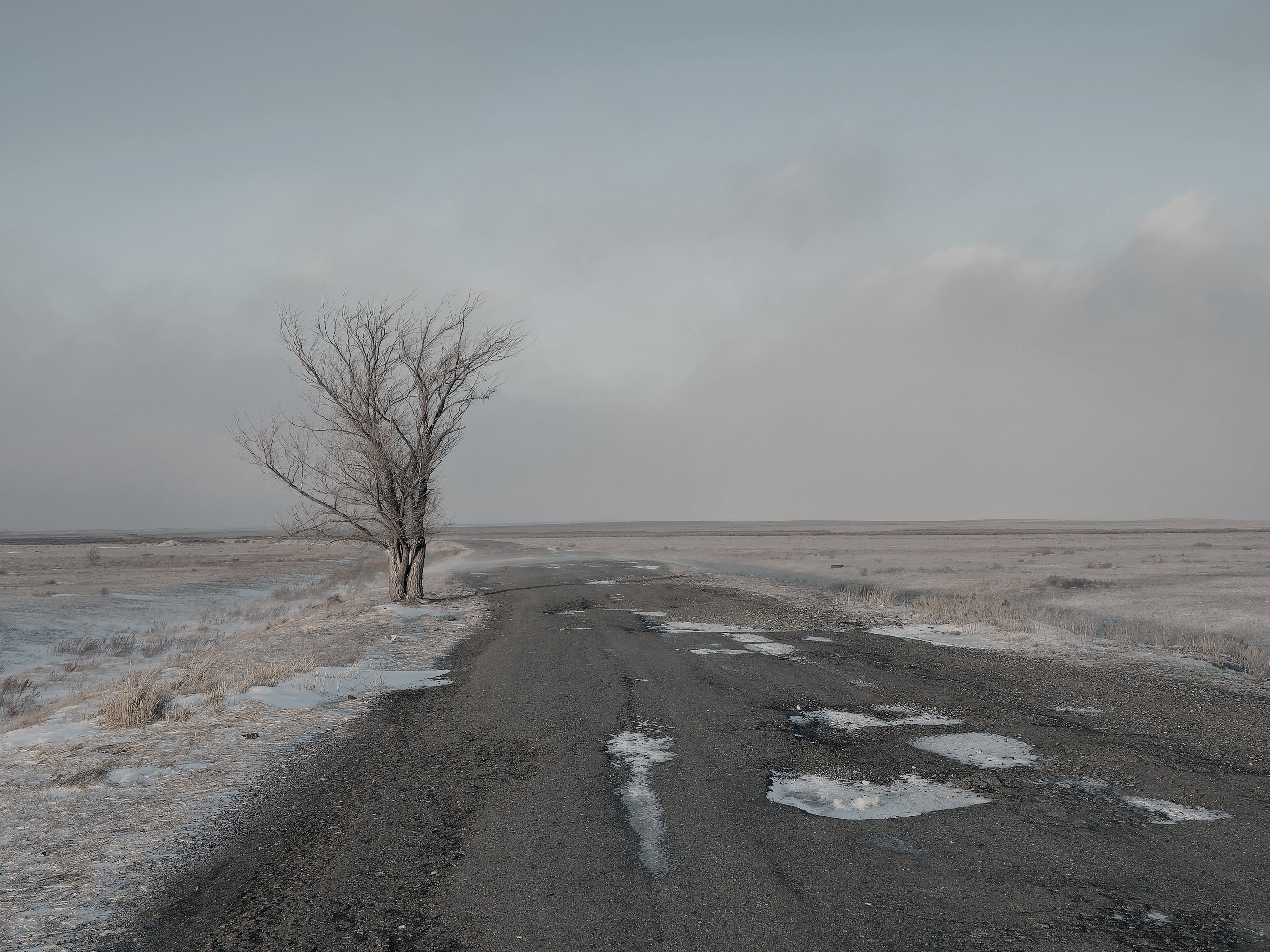 В какой-то момент по пути в Жезказган мы поворачиваем не туда. И три лишних часа ползём какими-то объездами по уже совсем мёртвой ледяной трассе. Ни одного жилища. Ни одного автомобиля. Интернета и телефонной связи здесь тоже нет. Асфальт оказывается так плох, что мы каждую минуту ждём, что машина вот-вот застрянет и мы останемся одни на этой абсолютно безлюдной трассе в сильный мороз.