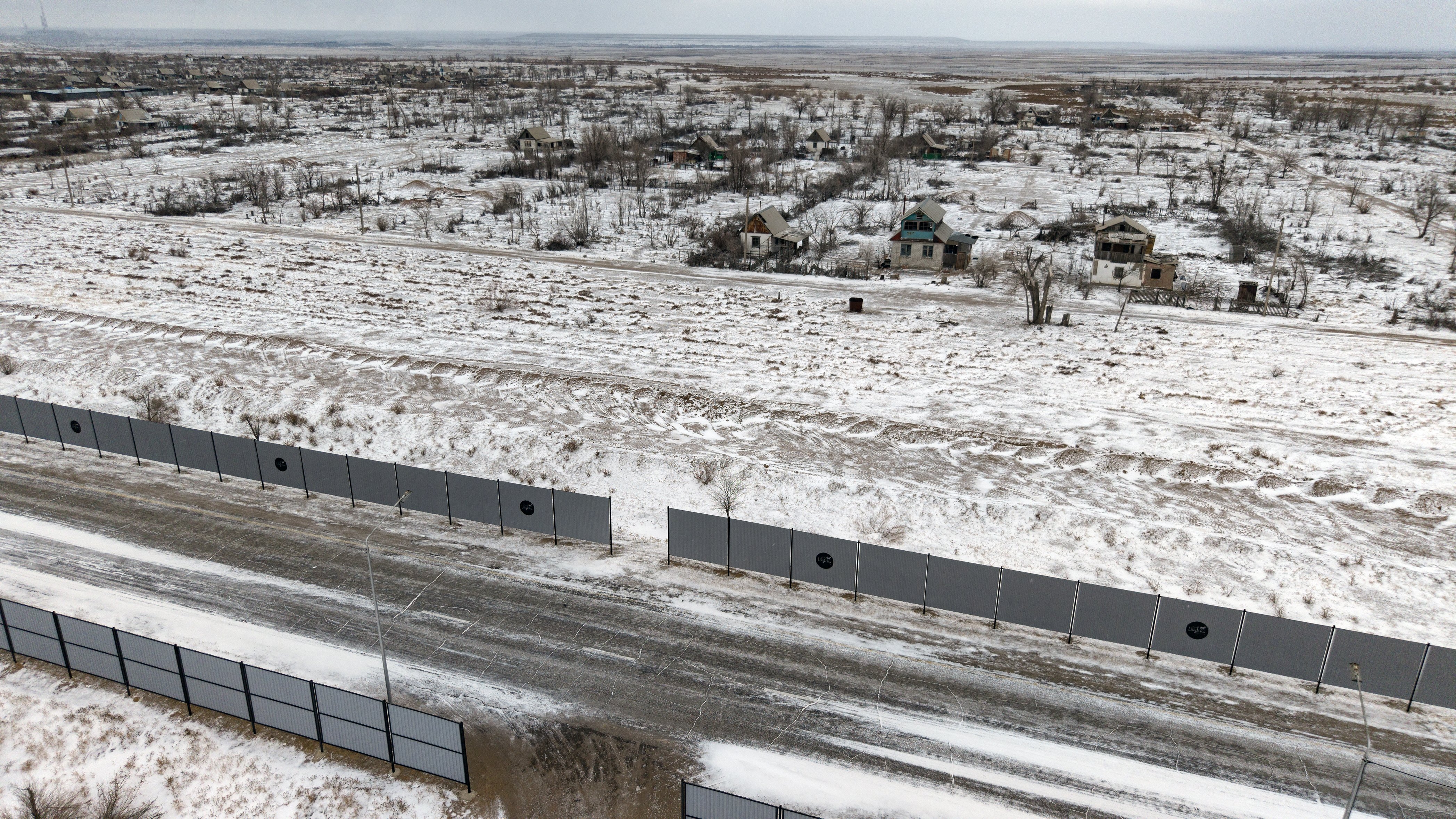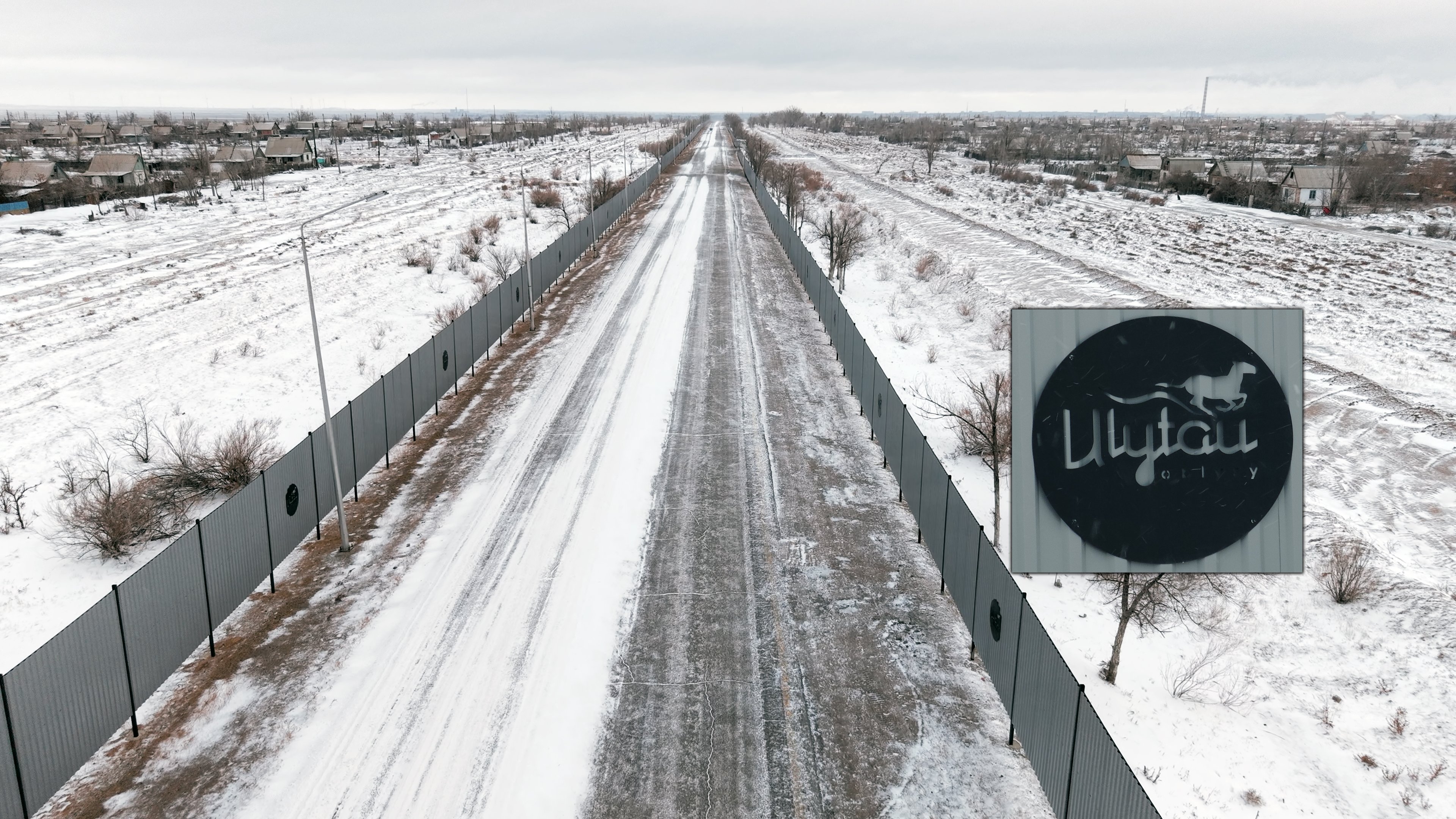 Но сам въезд производит странное впечатление. Многокилометровый участок от города до аэропорта старательно закрыт новеньким забором из металлического листа. Забором, на который прикреплены чёрные металлические круги с надписью Ulytau.
