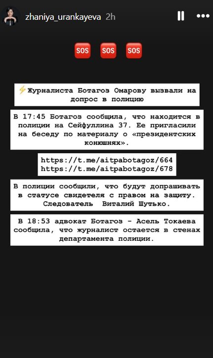 По информации коллег, журналистку допрашивали как свидетеля с правом на защиту. Её интересы на месте представляла адвокат Асель Токаева.