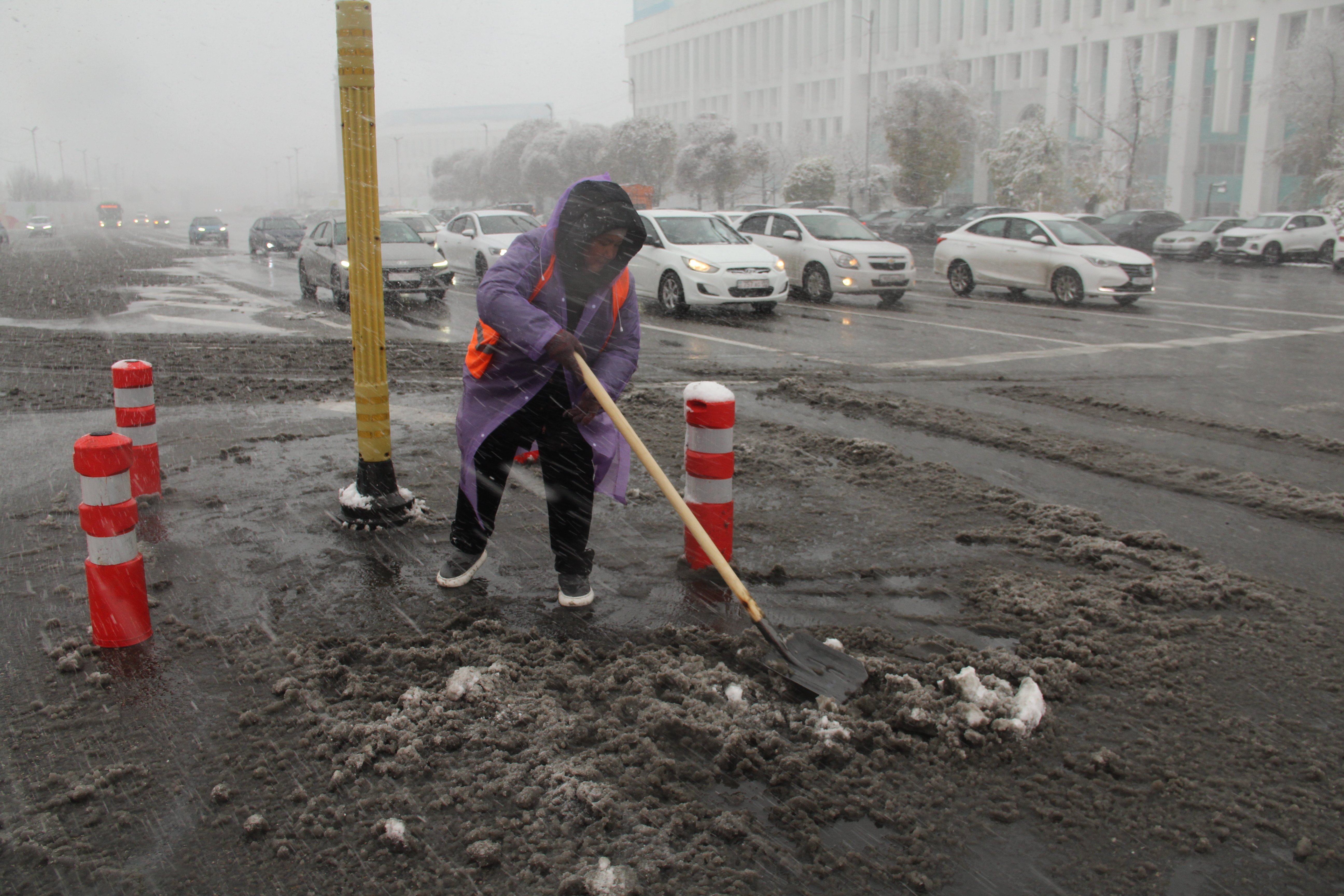 Журналиста Orda.kz метель застала на перекрёстке улицы Сатпаева и проспекта Назарбаева. Собравшимся там дворникам и снегоуборочной технике резко прибавилось работы.