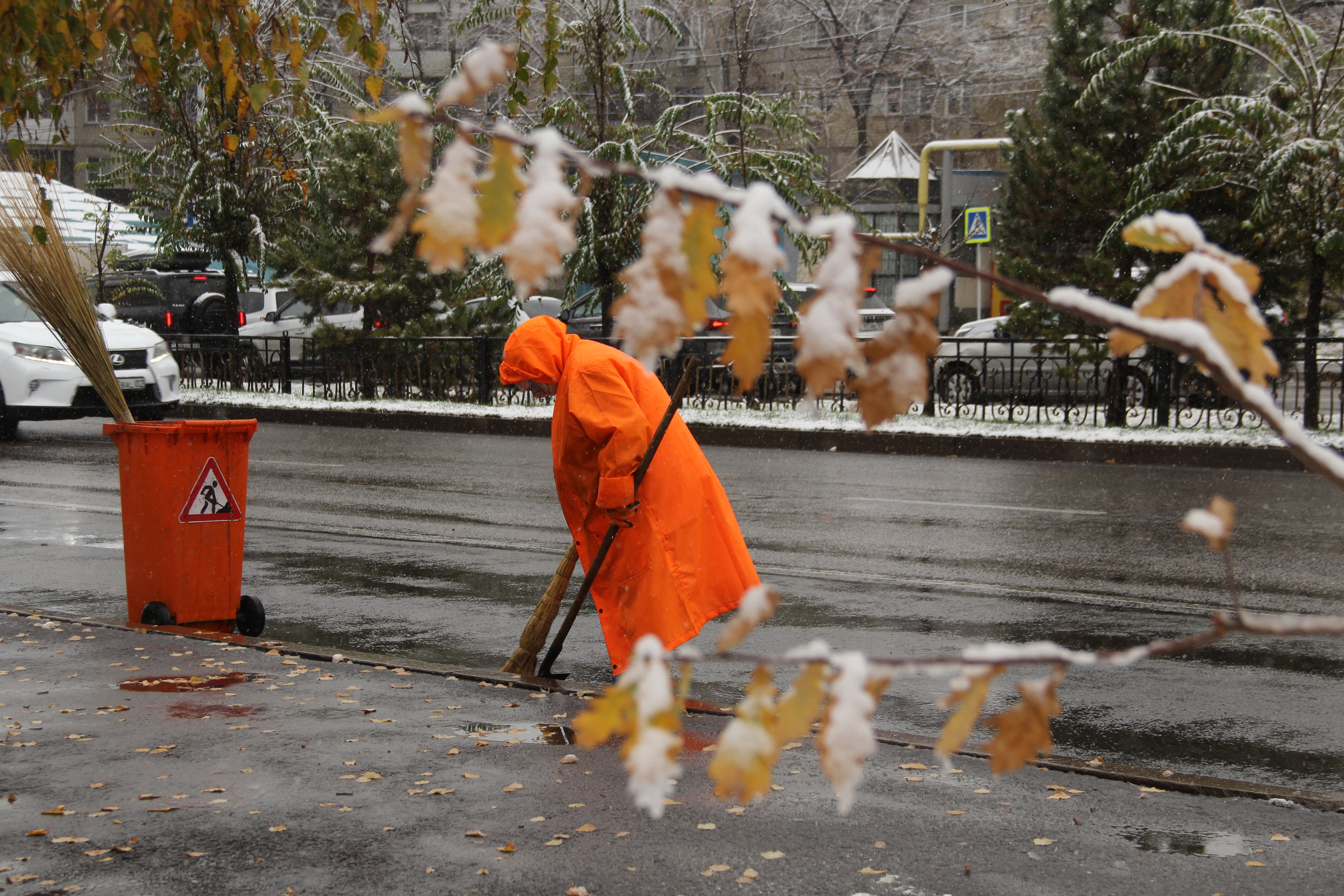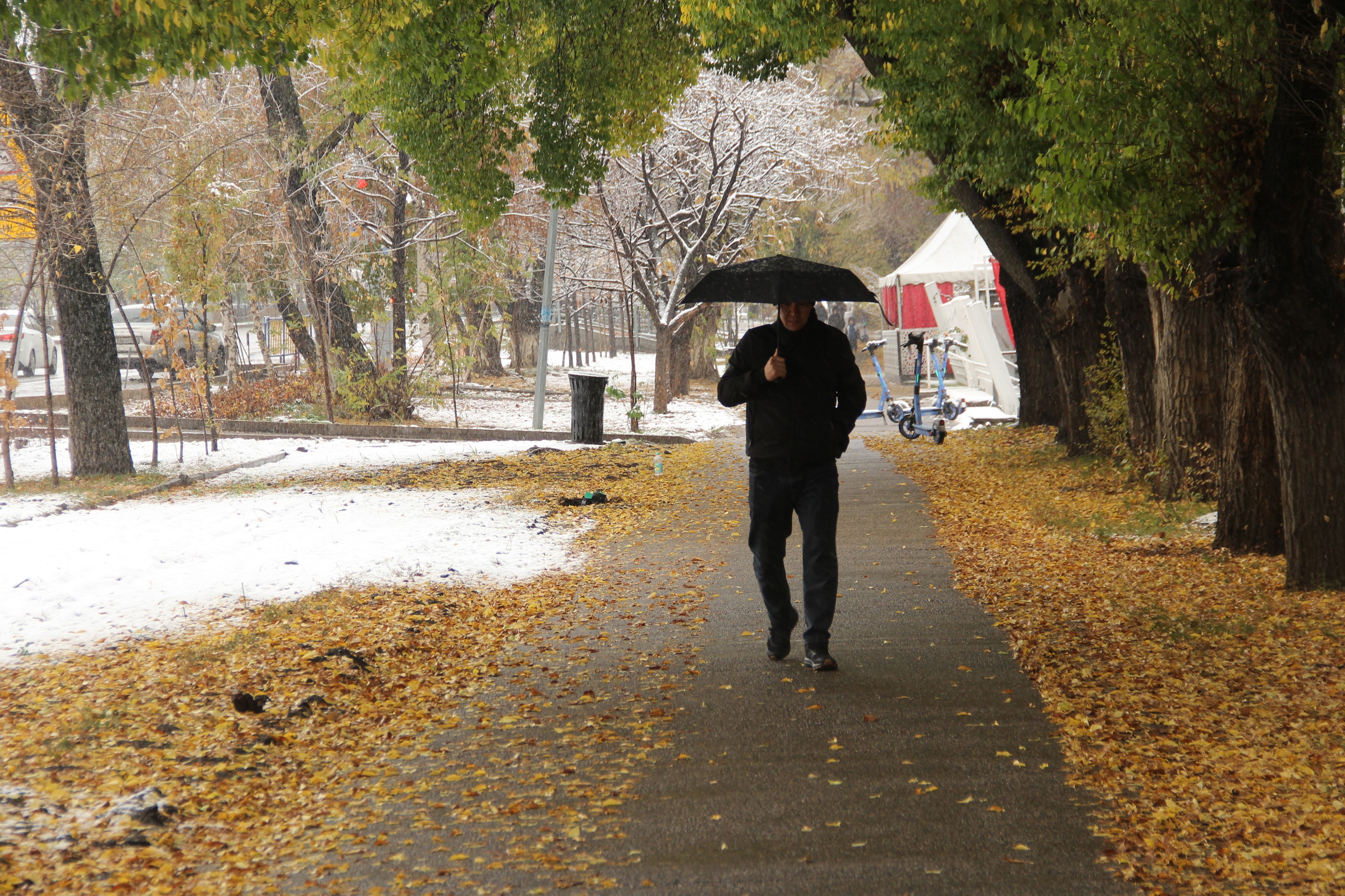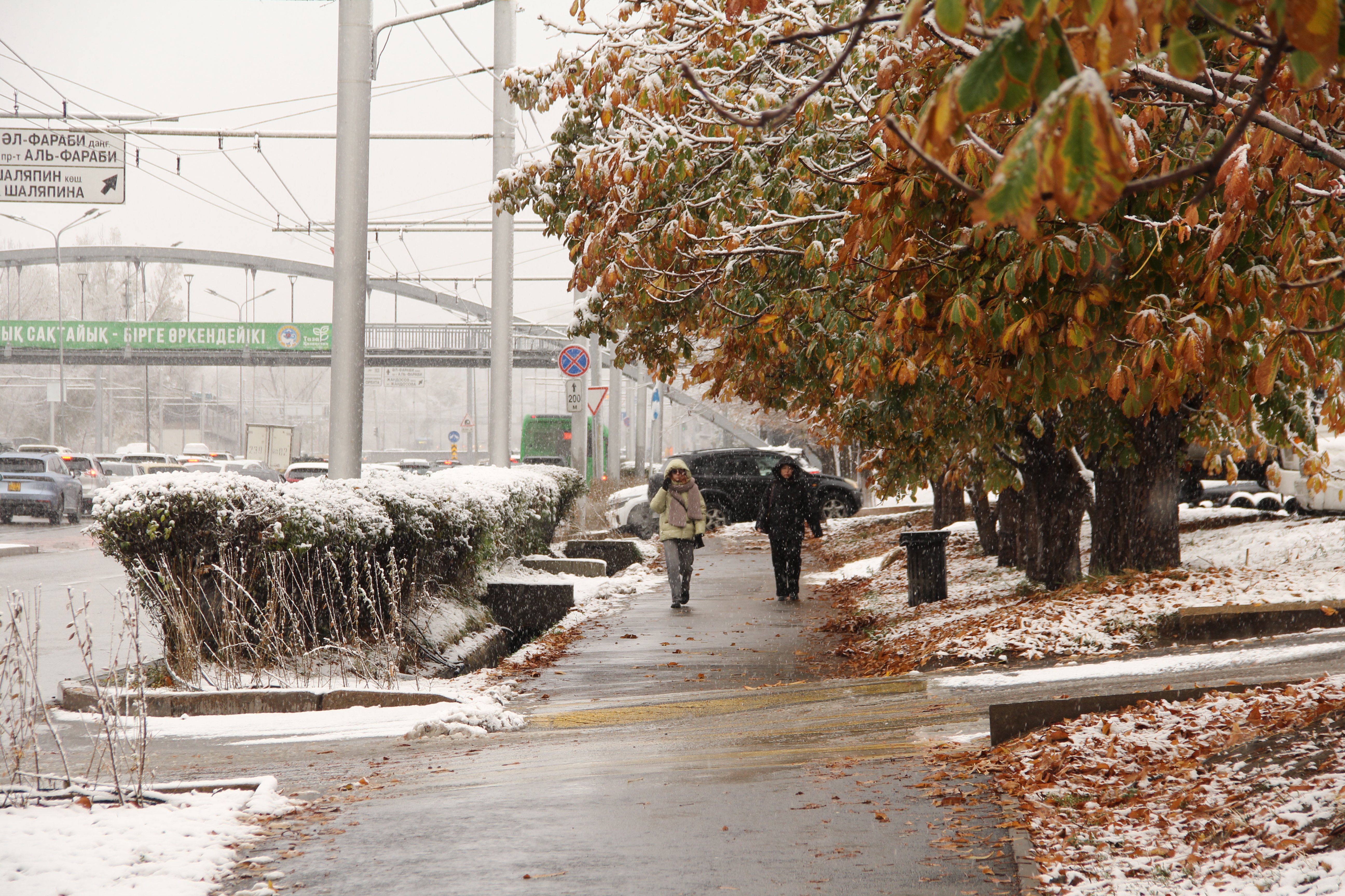 К утру 5 ноября город покрыла лёгкая пороша, но преимущественно на деревьях и траве. В сочетании с опавшей и просто жёлтой и красной листвой на какое-то время в Алматы получился весьма фотогеничный эффект зимаосени.