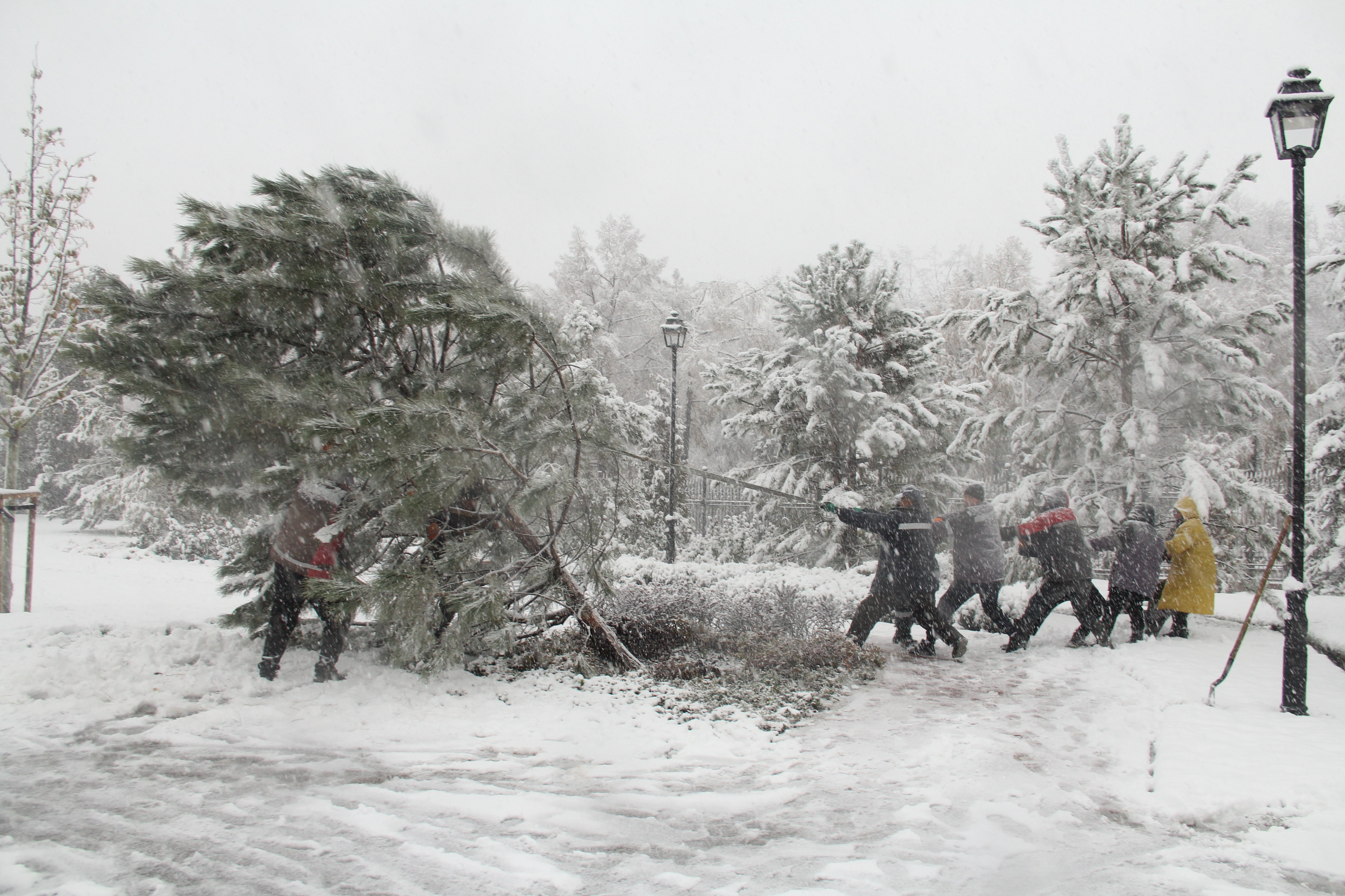 По пути журналист Orda.kz заглянул и в новый сквер на месте резиденции президента, который, по словам рабочих, как раз сегодня должны были открыть. Судя по всему, и здесь снегопад успел натворить дел. Возле одной из дорожек группа рабочих ставила на место крупную сосну.